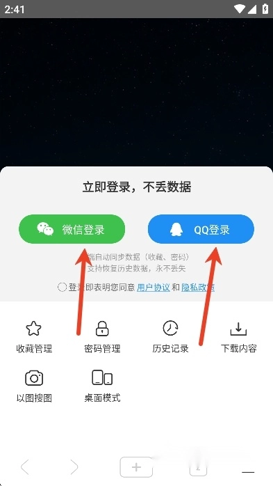 用户们需要使用微信号或者qq号登录注册账号,才能保存软件浏览数据和收藏网页网址