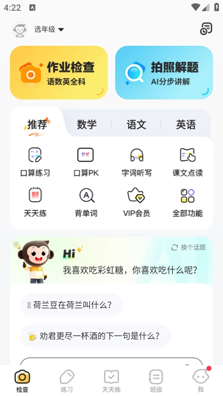 3、学习练习:AI精准练习与校内教材精准匹配,围绕薄弱知识点针对性出题;口算PK采用实时对战模式,有效激发竞争意识;同时还提供课文点读、字词听写等多种类型的练习。