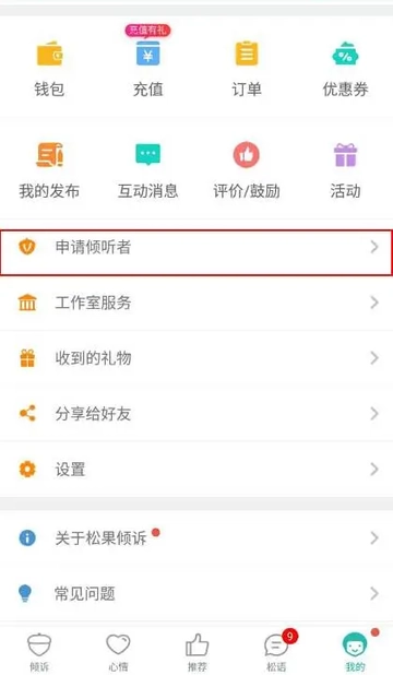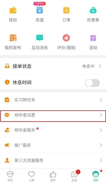 1、当你成为倾听者之后,在松果倾诉APP的“我的”页面中,点击进入“倾听者设置”选项。