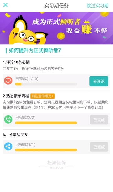 6、审核通过后,你就成为实习倾听者啦。若想晋升为正式倾听者,你得完成一些基础任务,比如评论他人心情、熟悉接单流程等。