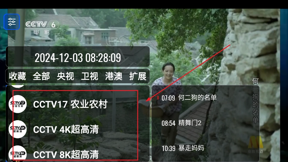 3、退出回看操作:当进入回看界面后,通过按上下键可唤出选台菜单,将光标移动至正在回看的节目处,点击OK键,即可返回该频道最新的直播画面。此外,也可连续两次点击返回键来实现同样效果,或者选择切换到其他频道。