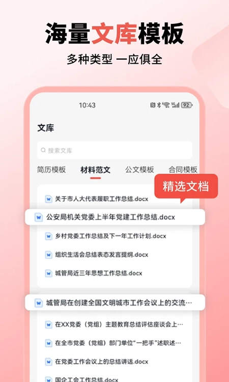 6、文库资源助力:拥有海量模板库,类型丰富,包含简历、合同、公文、工作总结等,用户能够直接借鉴或复用。