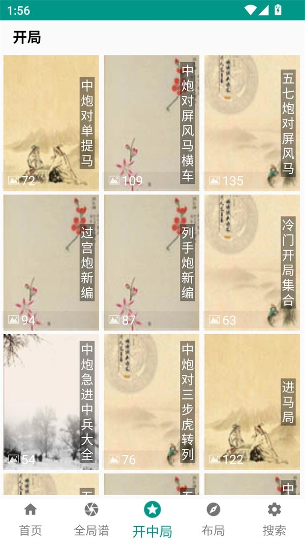 3、来到“开中局”界面,可以查看各类开局棋谱或者中局棋谱。