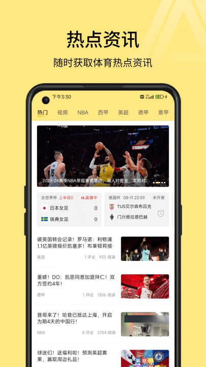 3、资讯:实时体育资讯和新闻头条,独家高质量的体育新闻盛宴。