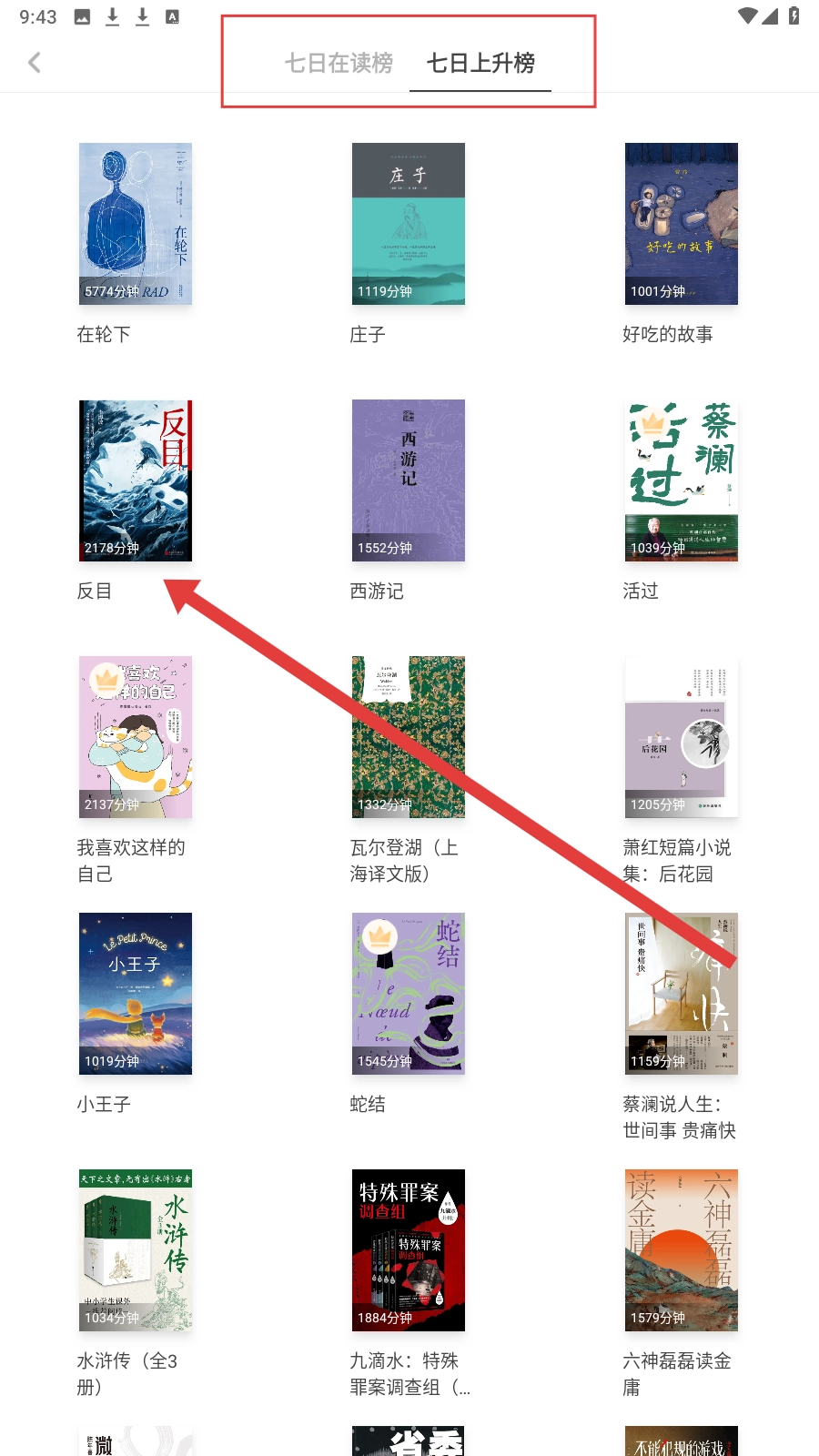 2、在书籍推荐页面,可切换【七日在读榜】【七日上升榜】查看不同榜单书籍。