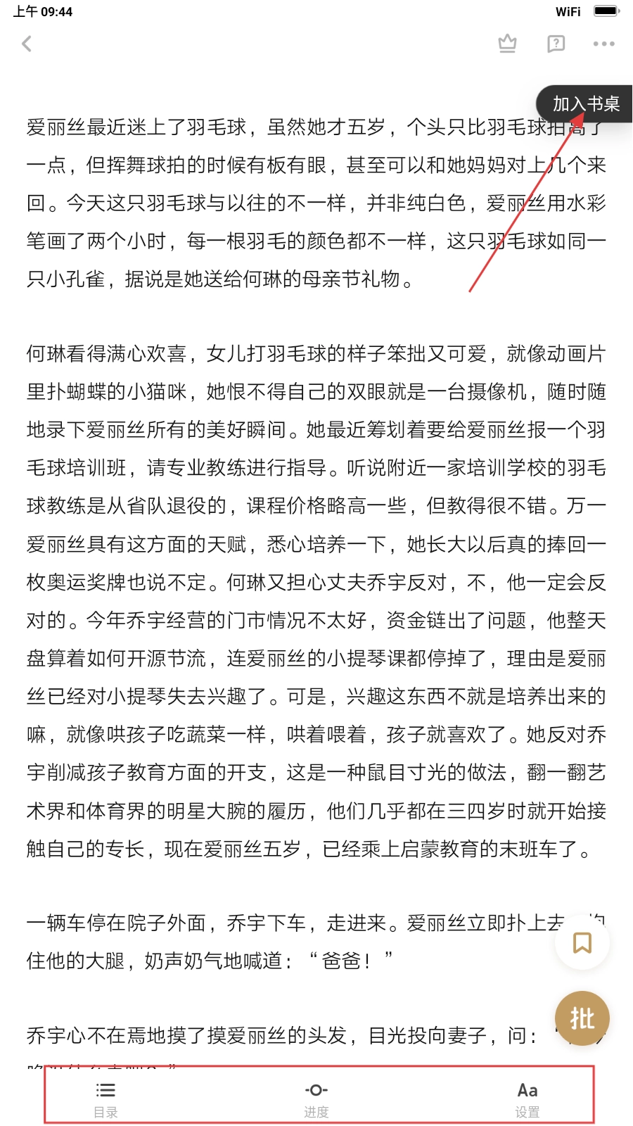 4、阅读时可点击【加入书桌】保存书籍,还能通过底部功能键调整阅读设置。