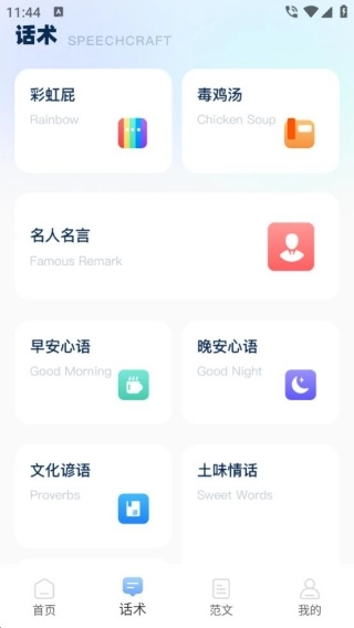 3、汇聚海量话术资源,涵盖彩虹屁、名人名言、早安心语等多种类型,以契合不同场景下的语言表达需要。