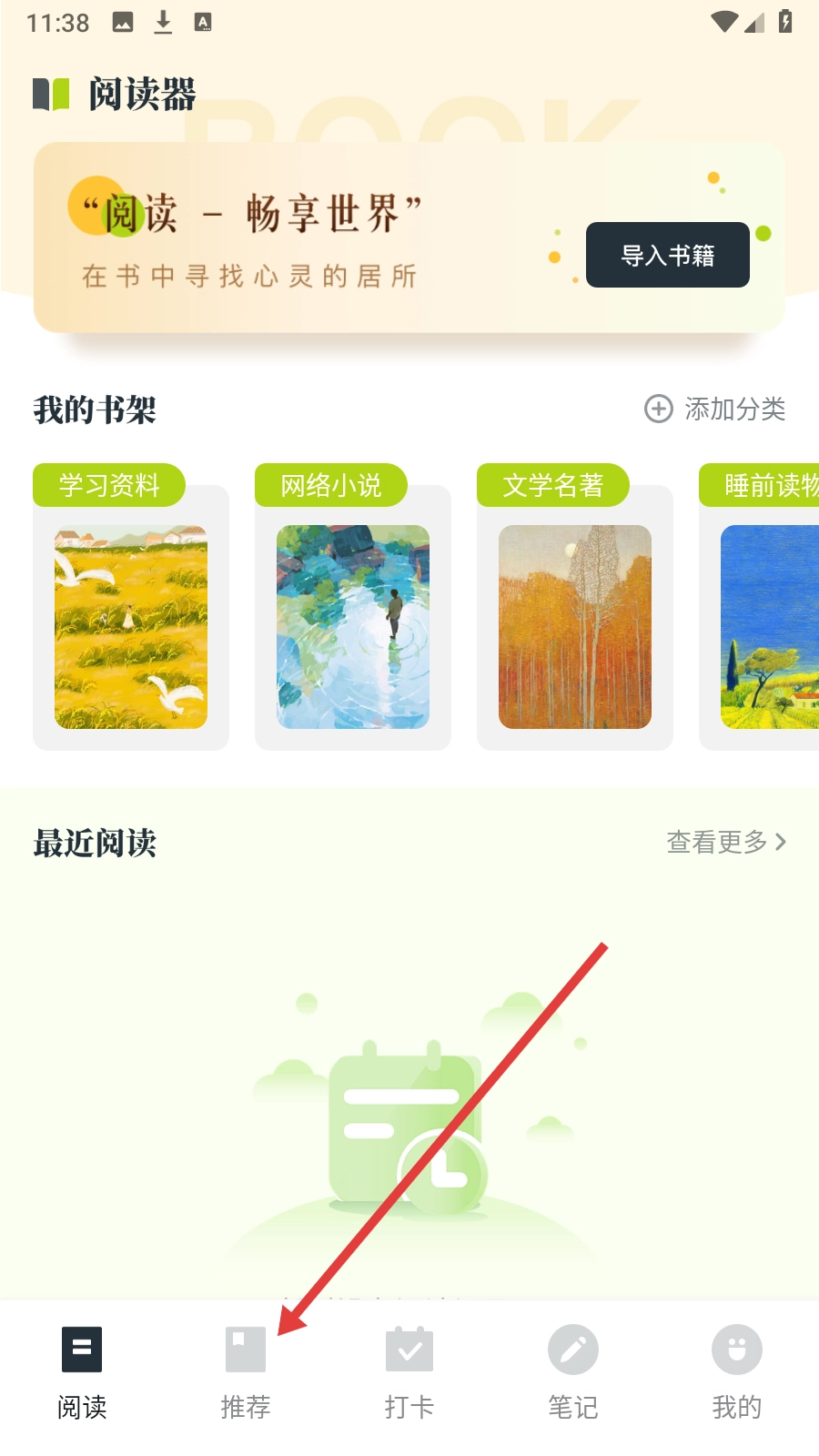 1、首页点击底部【推荐】,进入图书推荐界面选书。
