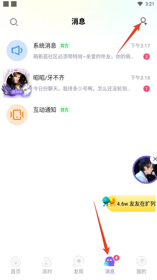 1. 开启伴唱交友应用,轻点屏幕下方的【消息】选项,接着点击右上角的加好友图标。