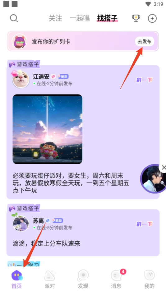 1. 开启伴唱交友应用,轻点下方的【首页】,接着点击右上角的【去发布】