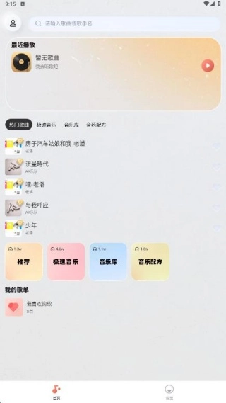 2、首页呈现了丰富的音乐素材,还有推荐、我的歌单管理等功能。