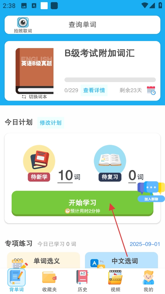 1、进入图图单词首页,点击今日计划的开始学习。