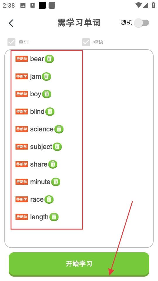 2、在需学习单词页面选择学习的单词,点击开始学习。