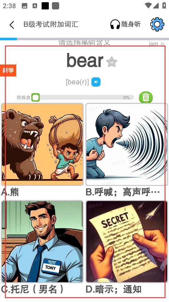 3、进入单词学习页面,可根据图片和选项学习单词,如bear。