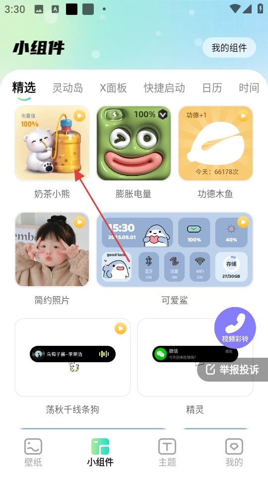 2、进入小组件页面,选择喜欢的小组件,如奶茶小熊。
