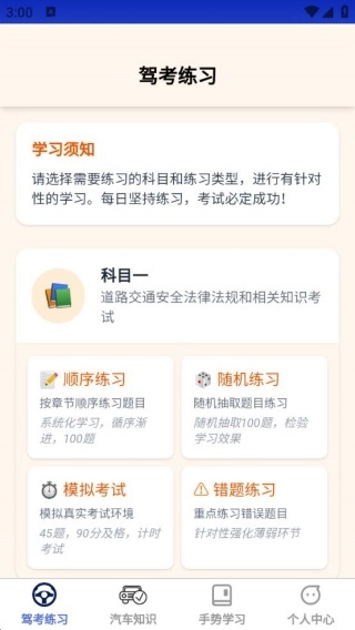 3、借助模拟考试与错题练习,帮助用户提高考试分数。同时,通过汽车知识学习以及交警手势学习,为用户后续实际驾驶奠定基础。