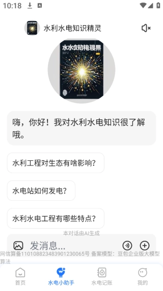 2、水利水电知识精灵,可解答诸如水利工程对生态的影响、水电站发电原理等各类水利水电相关问题,既具实用性,又有科普性。