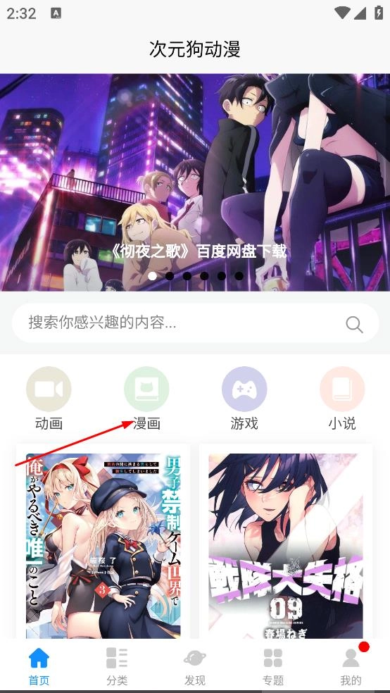1、在次元狗动漫首页,点击漫画,进入漫画页面。