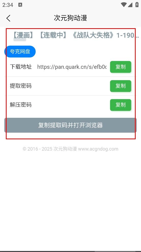 4、在信息页面,可查看漫画的地址、提取密码、解压密码等,进行复制等操作。