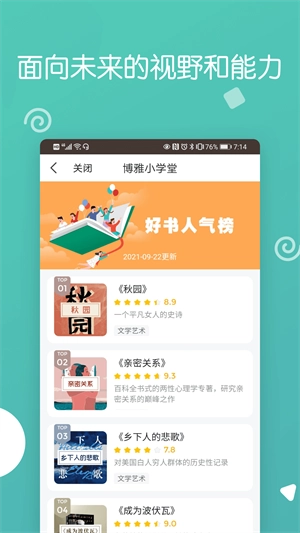 博雅小学堂涵盖经典儿童人文故事与绘本,孩子们能在饭时、晨起后、午休前、睡前等任意时段聆听。其中包含《说给儿童的中国历史》《唐诗三百首》《玉米熊说成语》《夏洛的网》《孔子学堂》《abby读英文绘本》《故事蜡烛》等。