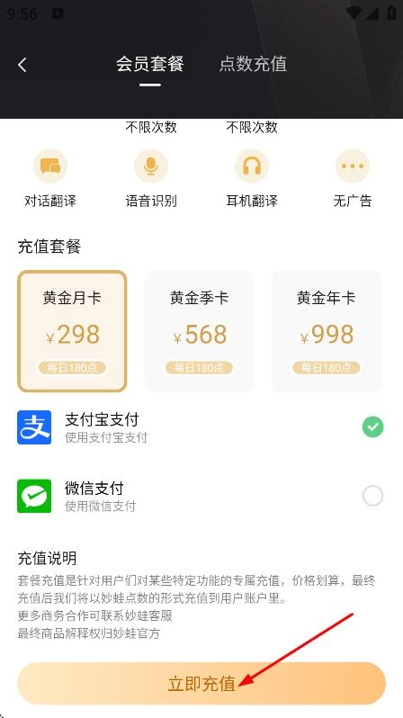 3、选择充值套餐和支付方式后,点击立即充值完成充值。