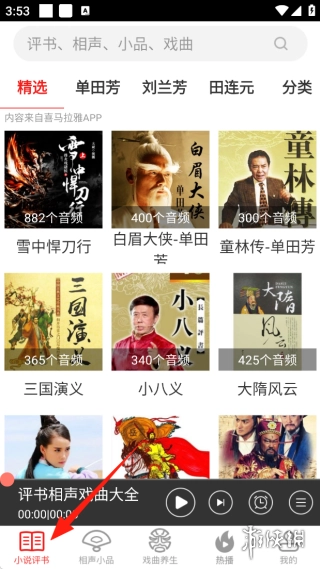 1、进入之后,首页呈现的是“小说评书”板块。在此板块,能够依据“精选”或者“评书人”来分类,进而挑选并收听自己想要的内容。