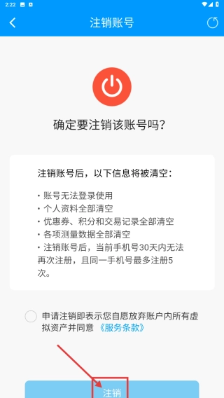 4、在注销账号确认页面,勾选同意协议后,点击注销按钮,完成账号注销操作。