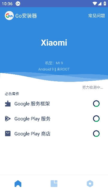 Go谷歌安装器三件套,能一键安装谷歌三件套。用户安装此Go安装器后,打开软件就能知晓手机是否已安装。若未安装,只需点击“GO”,即可一键自动检测并安装谷歌三件套,极为便捷。要是碰到各类问题,还可查看常见问题解答,解决使用过程中的所有难题。欢迎大家前来体验。