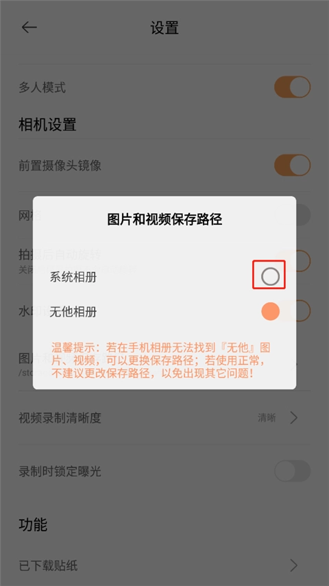 4、点击当前系统相册,就能把照片保存到手机中。但要留意,如果在手机相册里找不到无他相机拍摄的照片,可更换保存路径。要是使用的是“真”模式,不建议更改保存路径,以防出现其他状况。