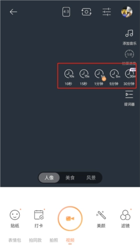 3、接着在右侧的添加音乐、拍摄时长、拍摄速度、提词器中,点击拍摄时长,其中用户仅能看到10秒、15秒、1分钟、5分钟、30分钟这几个视频时长选项。