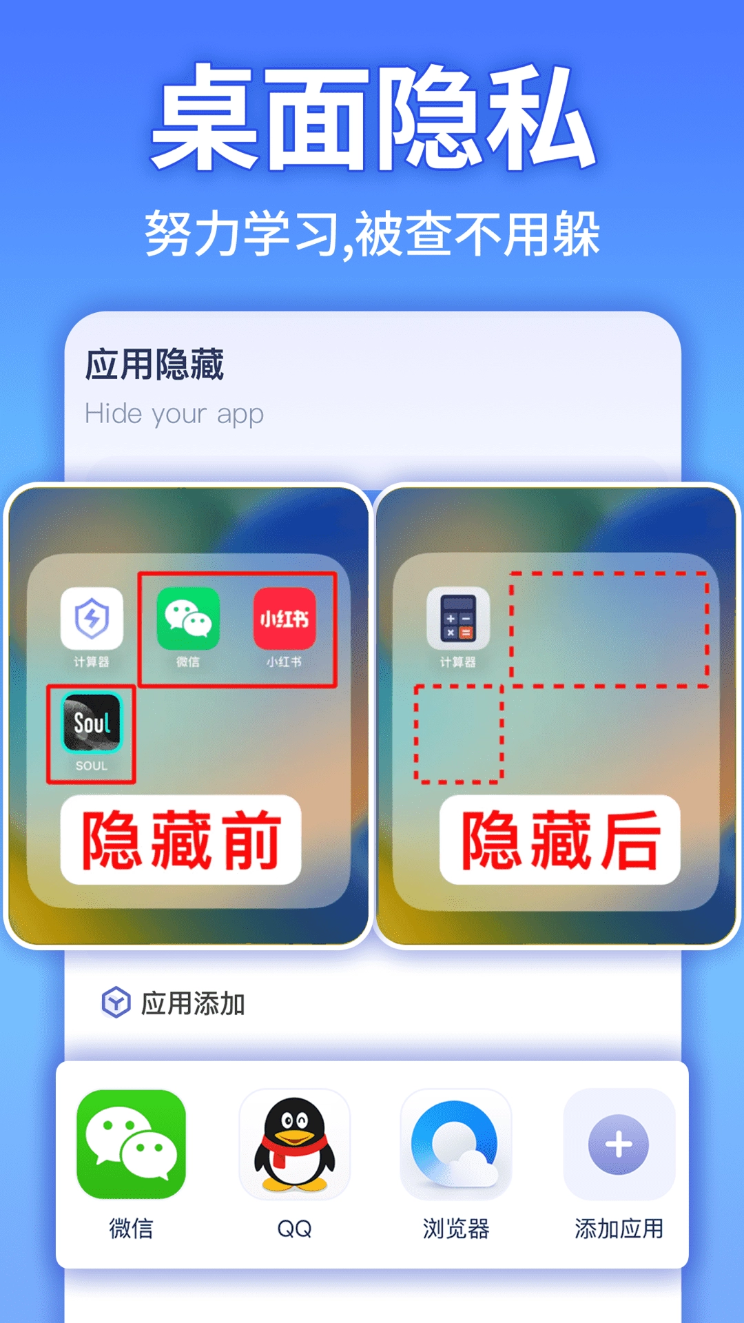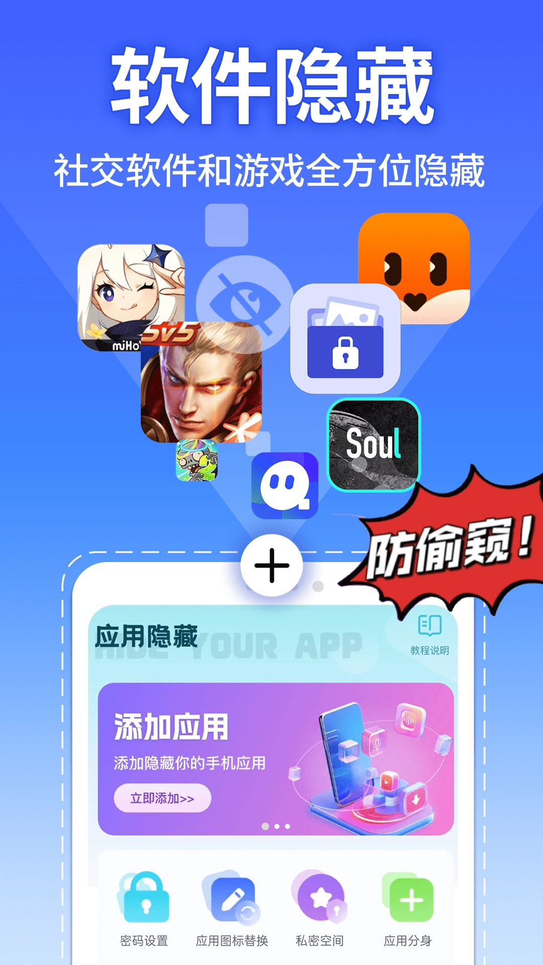 软件隐藏大师深受众多朋友喜爱,它能助力用户一键快速隐藏各类软件或游戏,有效保护您的隐私。只有在使用对应的密码解锁手机后,才能查看手机中的所有应用。这款软件功能极其强大,您所需的功能在这里应有尽有,能够满足每一位用户的需求!