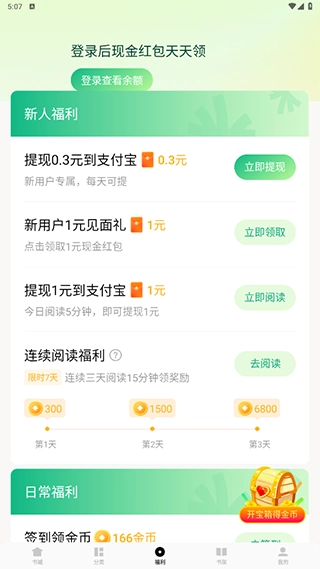 3、点击下方的“福利”,还可以完成每日的任务,来获得现金奖励。