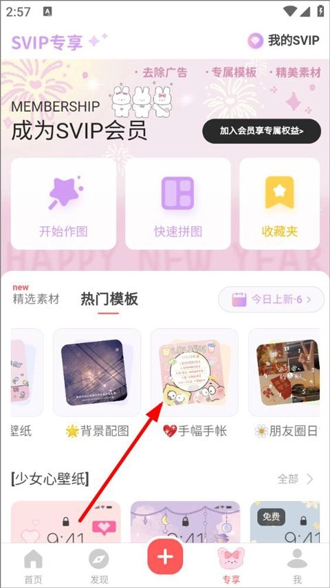 2、进入专享页面,用户就可以查看精选素材、热门模板、作图、拼图等,在热门模板中找到手账栏目。