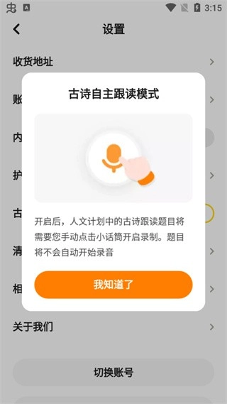 继续点击【我知道了】即可成功开启古诗自主跟读模式。