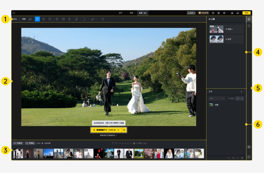 功能快捷栏整合了“AI祛除路人”与“AI图像增强”这两大AI功能模块,只需一键操作,就能高效处理图像。
