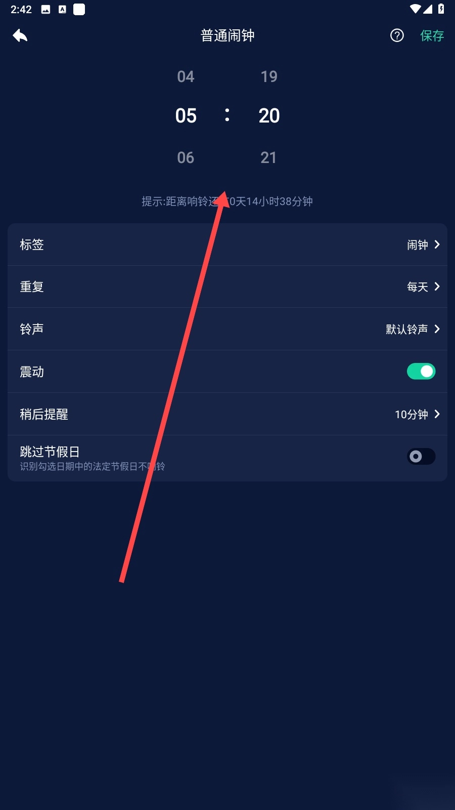 2. 在普通闹钟的界面上,依据个人需求对时间、铃声等设置进行调整,调整完毕后,点击右上角的【保存】按钮。