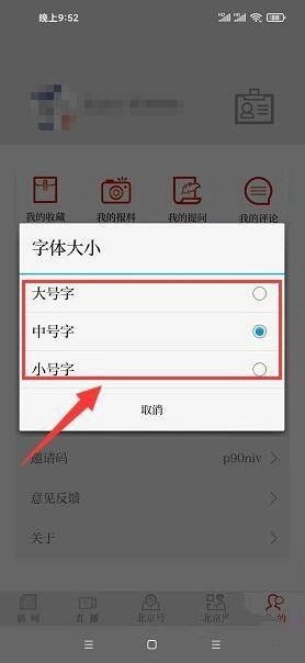 2、在“我的”界面中,选择“正文字号”栏目。
