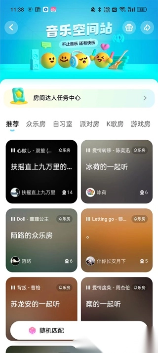 4. 若想快速进入听歌房间,点击随机匹配;若要自主选择歌曲并成为房主创建房间,点击创建房间即可。