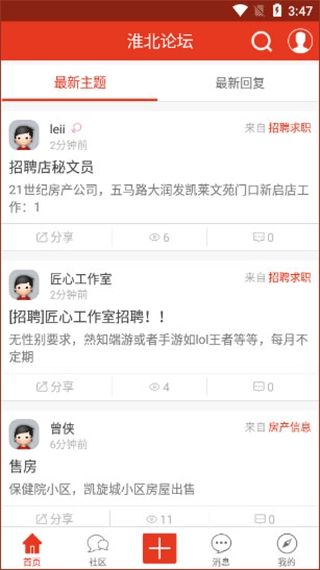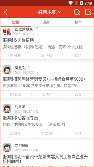 4、求职招聘:用户能够在此处发布求职或者招聘相关信息,找工作,就来淮北论坛。