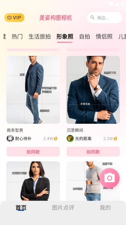 1. 拍照姿势引导:拥有海量模板,实时展示角度与动作示范,轻松化解“四肢僵硬”“表情尴尬”的困扰。
