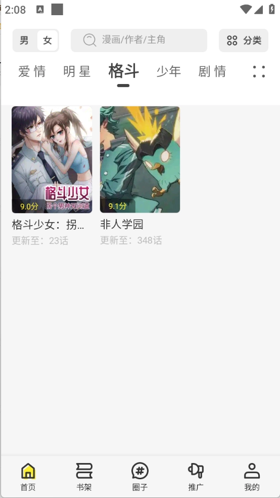 2. 首页顶部栏汇聚了多种资源类型,涵盖爱情、格斗以及少年等类别。