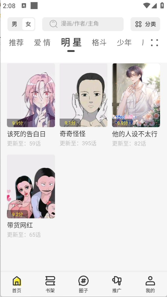 创漫客,一款超精彩的漫画阅读软件,全网精彩漫画实时为你更新,助你快速找到感兴趣的漫画资源。软件设有详细分类专区,爱情、明星、格斗、少年等多种类型,应有尽有,无论你钟情何种题材与画风,都能在此轻松寻得。而且,软件每日还会为你推荐近期热门精彩漫画,让你迅速发现优质好漫!