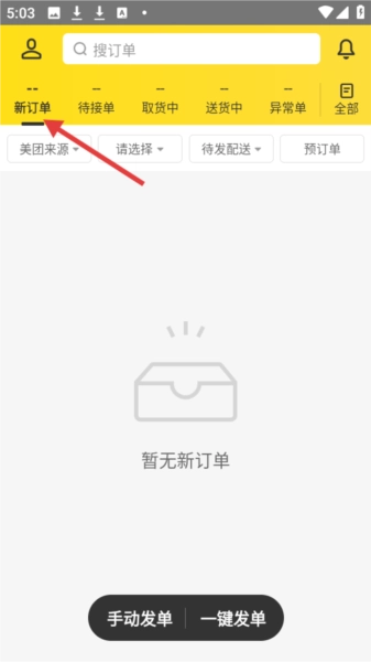 2. 在订单管理页面,设有搜订单栏,并划分了新订单、待接单等不同板块。目前页面显示暂无新订单,同时该页面提供手动发单与一键发单两种方式。