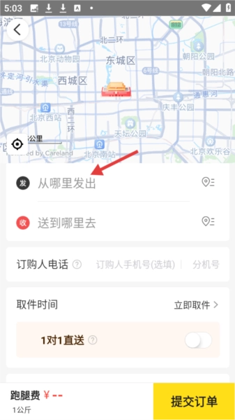 3、订单填写页面的背景是北京地图,在此页面需填写发件地址、收件地址以及订购人电话等信息,此外,还能够设置取件时间并完成提交操作。