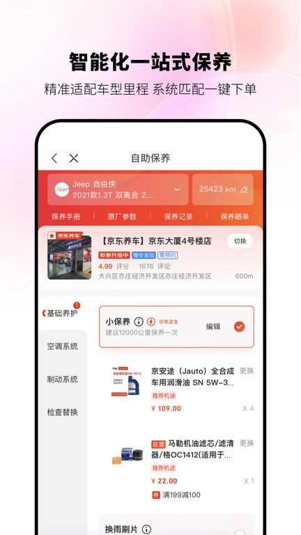 ·一站式保养:线上购买,线下保养,一键匹配,轻松搞定。京东养车提供从商品购买到服务实施的一站式解决方案,用户只需在上选择服务项目,系统会自动匹配适合的门店和技师,省去繁琐的流程。