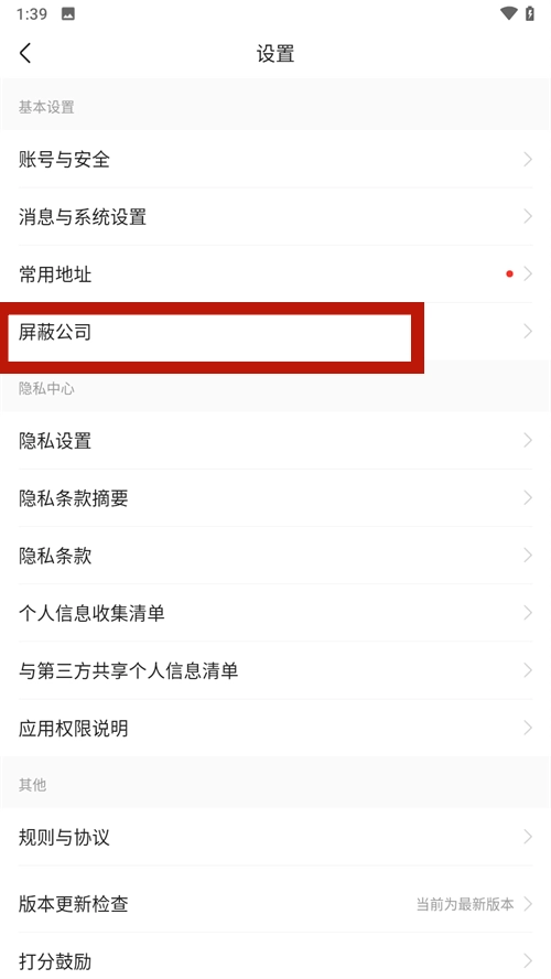 2、进入“设置”以后点击“屏蔽公司”一项;