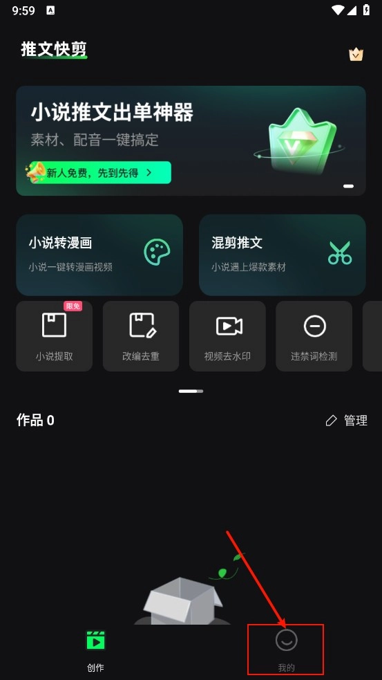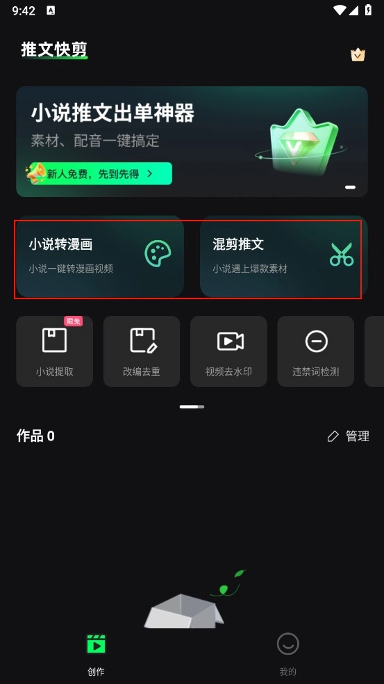 2、来到“创作”板块,这里包含小说转漫画、混剪推文以及相关创作工具。