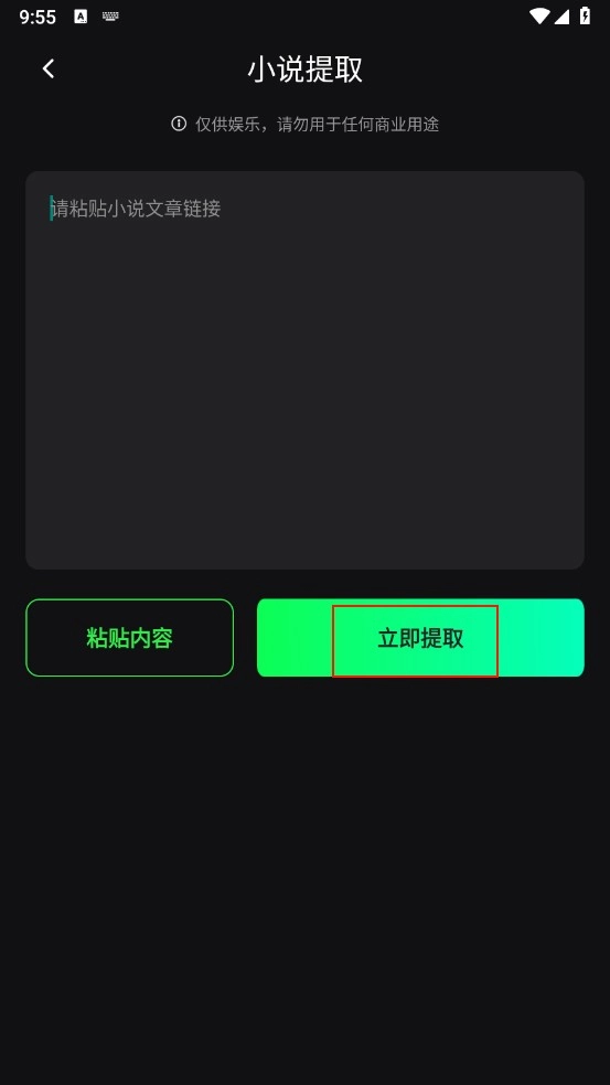 4、接下来打开“小说提取”,在此处需输入小说的文章链接,点击“立即提取”,之后就能复制并使用了。
