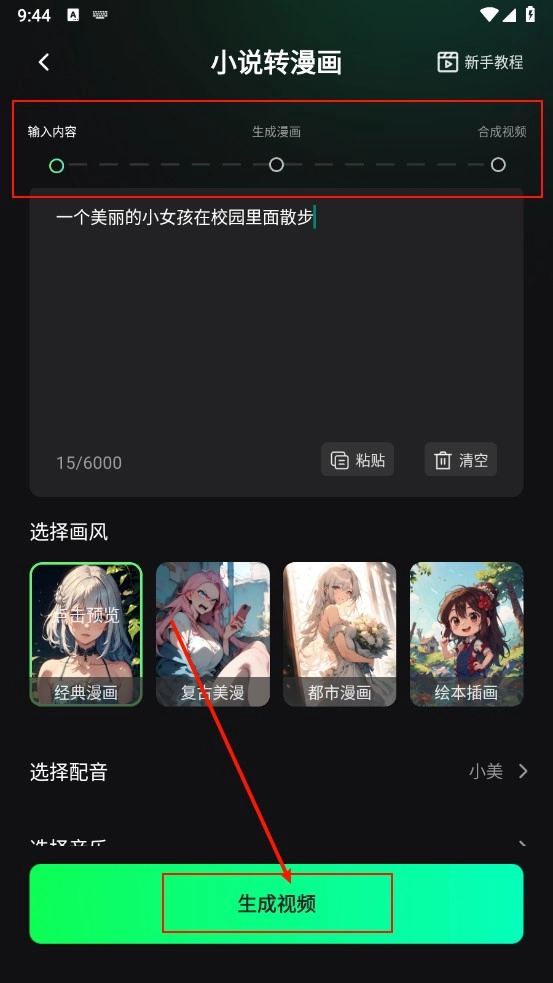 3、点开“小说转漫画”,输入相关内容,挑选风格、配音等,点击“生成视频”,就能生成对应的作品。