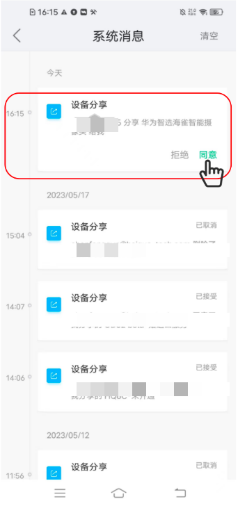 4、设备分享信息会发送给被分享者,被分享者点击“同意”,即可完成分享。